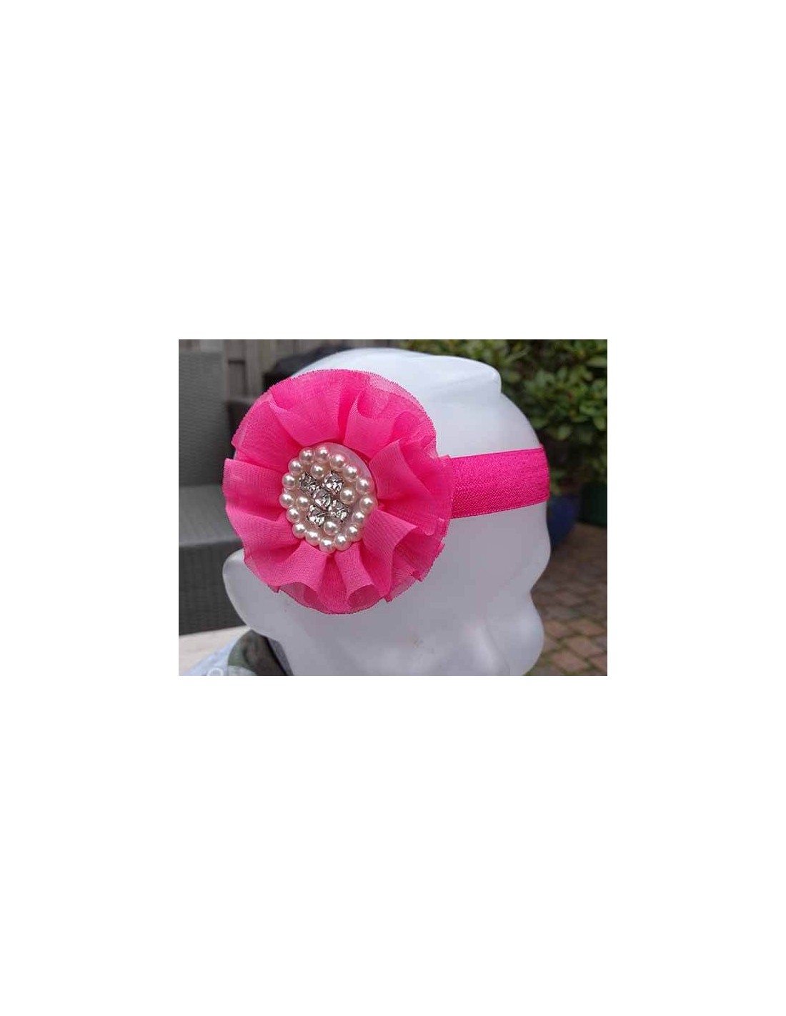 Super lief haarbandje met fuchsia bloem met steentjes 80 mm